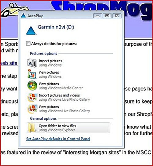 Step 2![]() Connect your Garmin Satnav to your computer using the USB cable it came with. When it has powered on, a window like the one in the picture above will appear. Select the option: "Open folder to view files". |